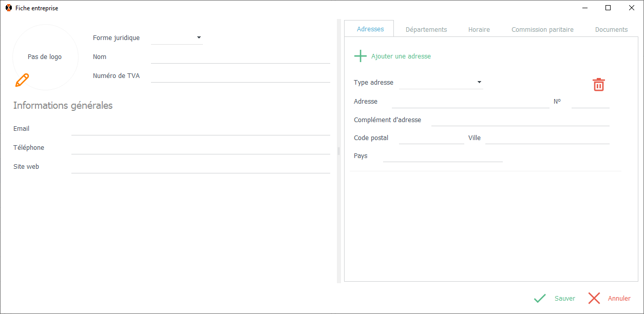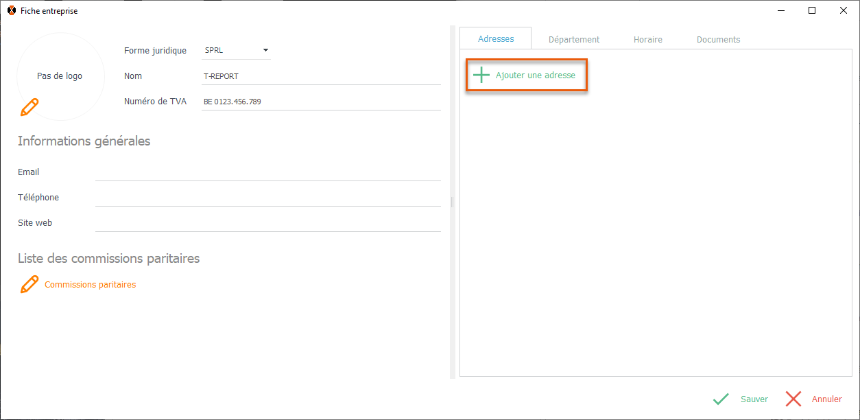 Adresse Cliquez sur "Ajouter une adresse" pour encoder l'adresse de l'entreprise. Remarque: Vous pouvez encoder plusieurs adresses. Encodez l'adresse.