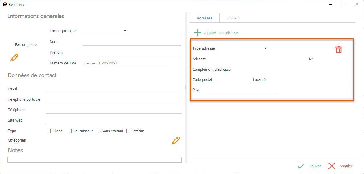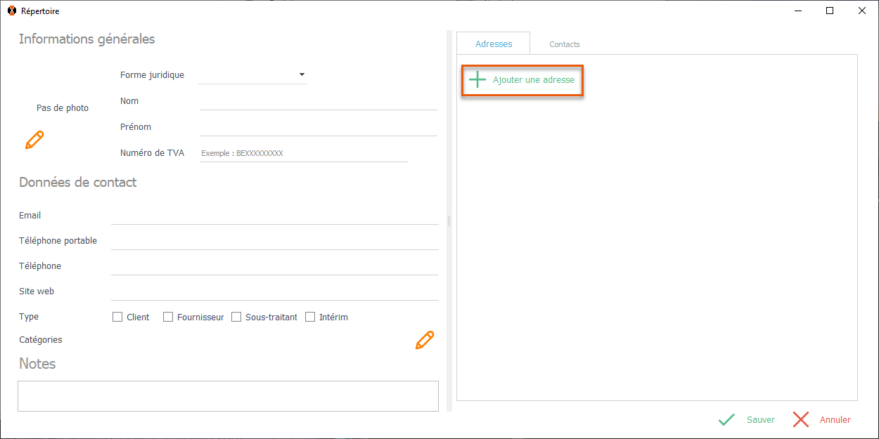 Ajouter une adresse au contact Cliquez sur "Ajouter une adresse" Astuce: Vous pouvez créer plusieurs adresses pour un même contact (siège social et domicile) ! Complétez la fiche et validez en cliquant sur "Sauver"