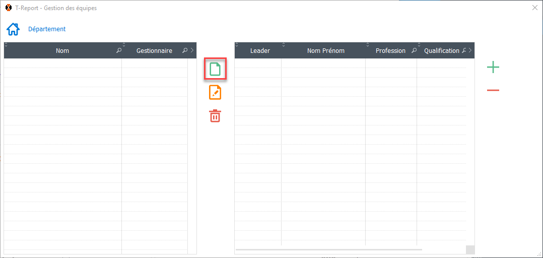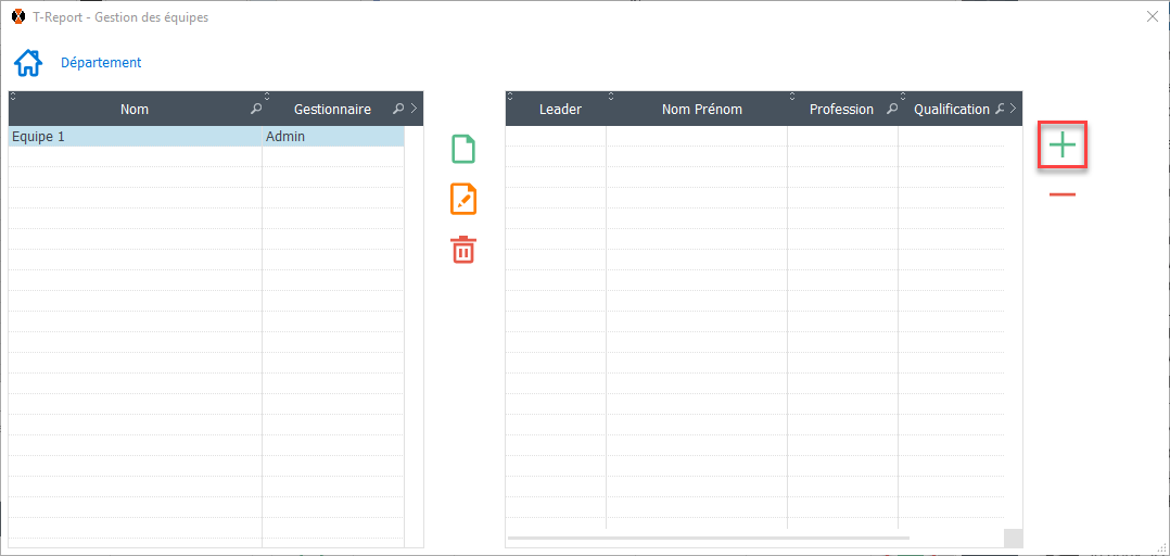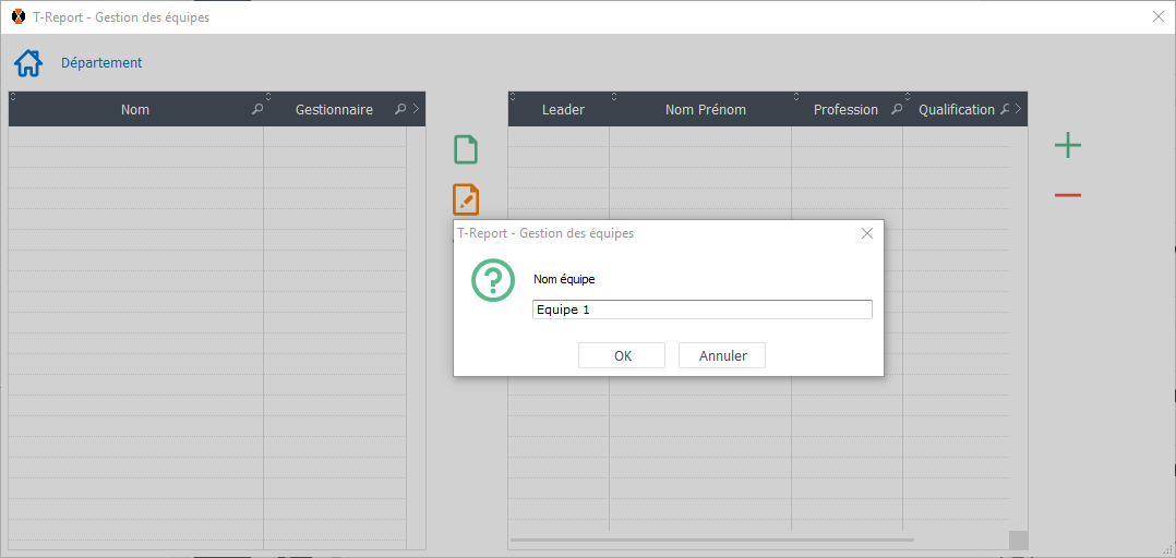 Ajouter une équipe Cliquez sur l'icône "Ajouter" Spécifiez le nom de votre équipe et valider en cliquant sur "OK". Cliquez sur l'icône pour ajouter des membres l'équipe. Sélectionnez le(s) collaborateur(s) et cliquez sur "Valider" pour sauver.