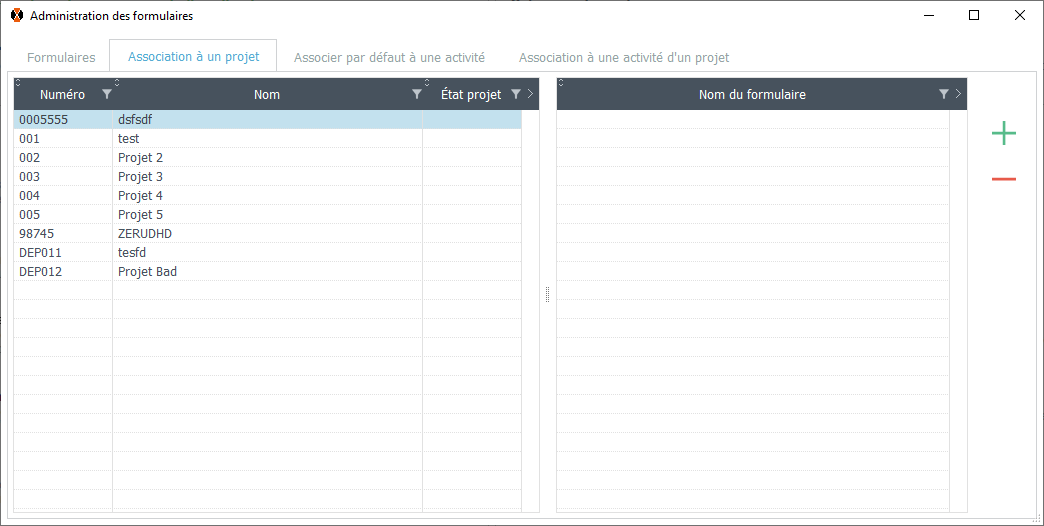 Associer un formulaire à un projet Sur cette page, vous pouvez lier les formulaires créés à un ou plusieurs projets à l'aide des boutons pour ajouter et pour retirer.