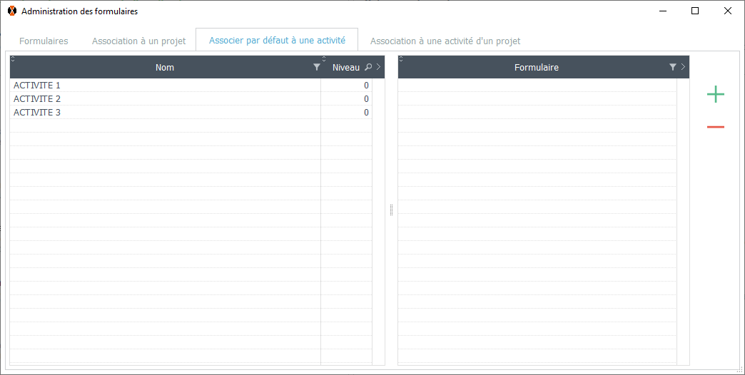 Associer un formulaire à une activité par défaut Sur cette page, vous pouvez lier les formulaires créés à une ou plusieurs activités à l'aide des boutons pour ajouter et pour retirer.