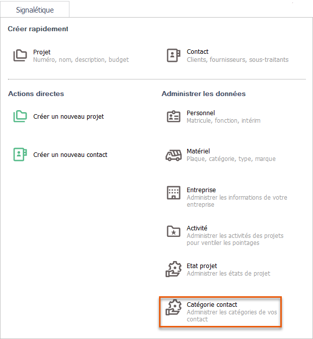 Cette partie du signalétique concerne l'administration des catégories de contact (client, fournisseur, sous-traitant ou intérim).