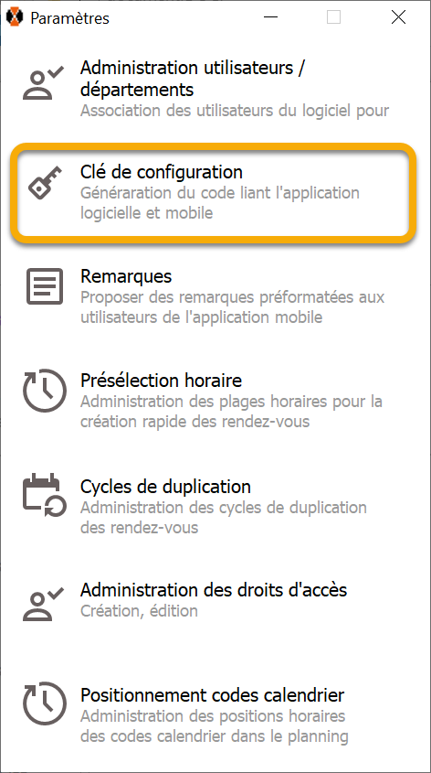 Le module "Clé de configuration" permet de créer des profils de droits d'accès aux fonctions du logiciel.