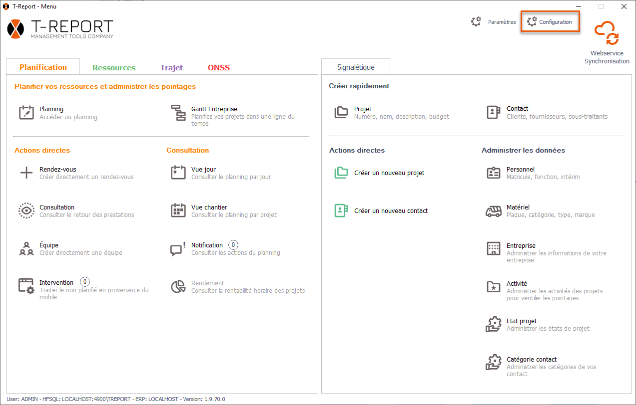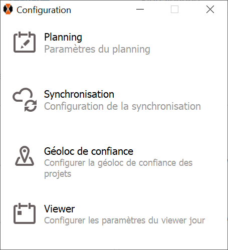 1.9. CONFIGURATION Le module "Configuration" est exclusivement réservé au service technique de Management Tools Company. Le menu "Configuration" est composé de 4 sous-menus: "Planning" "Synchronisation" "Géoloc de confiance" "Viewer"