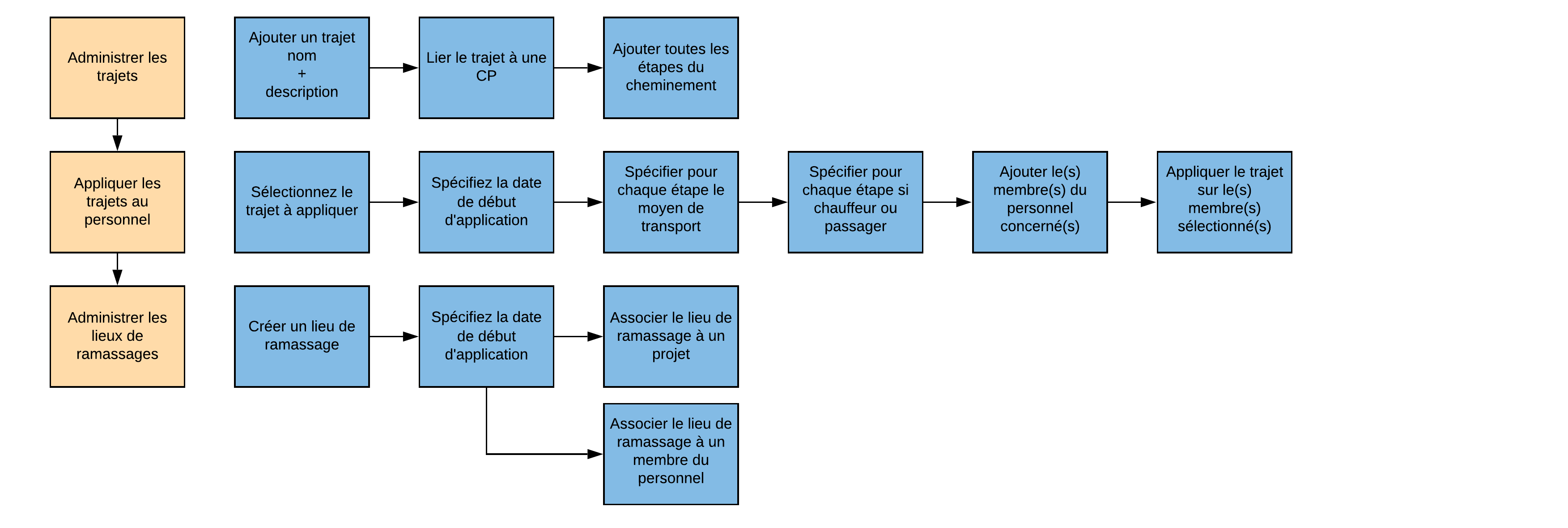 Consultez la rubrique "Lieux de ramassages" de l'onglet "Trajet" pour administrer les lieux de ramassage (création et association à un projet et/ou utilisateur)