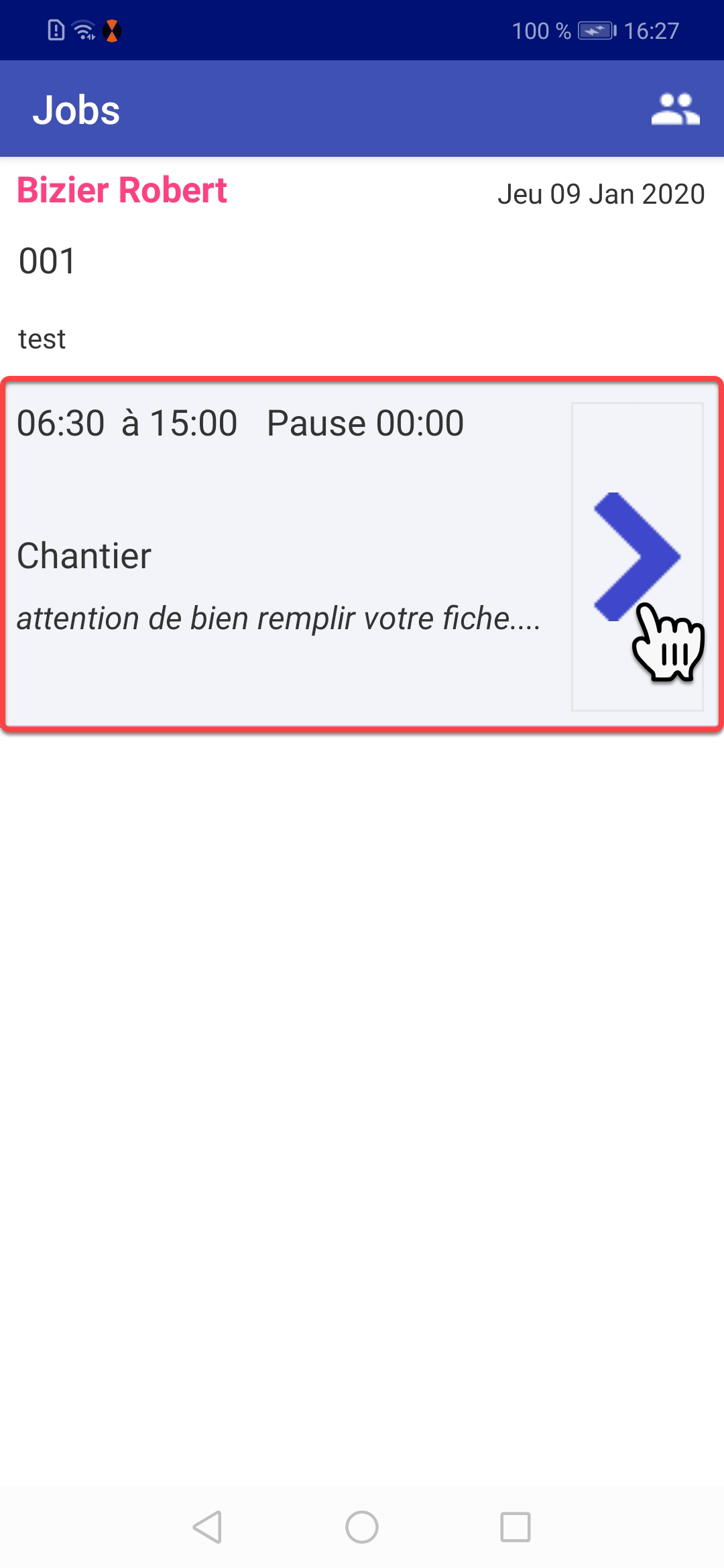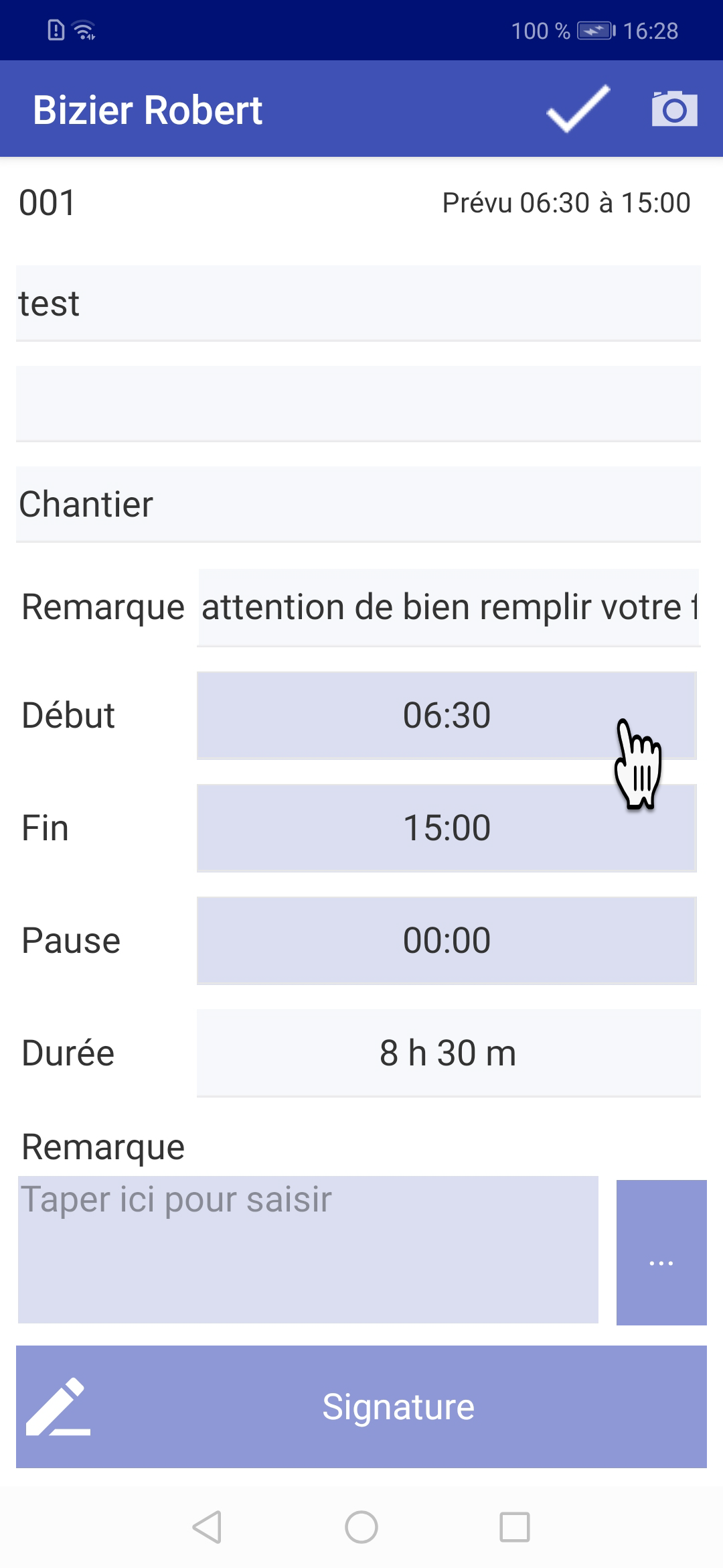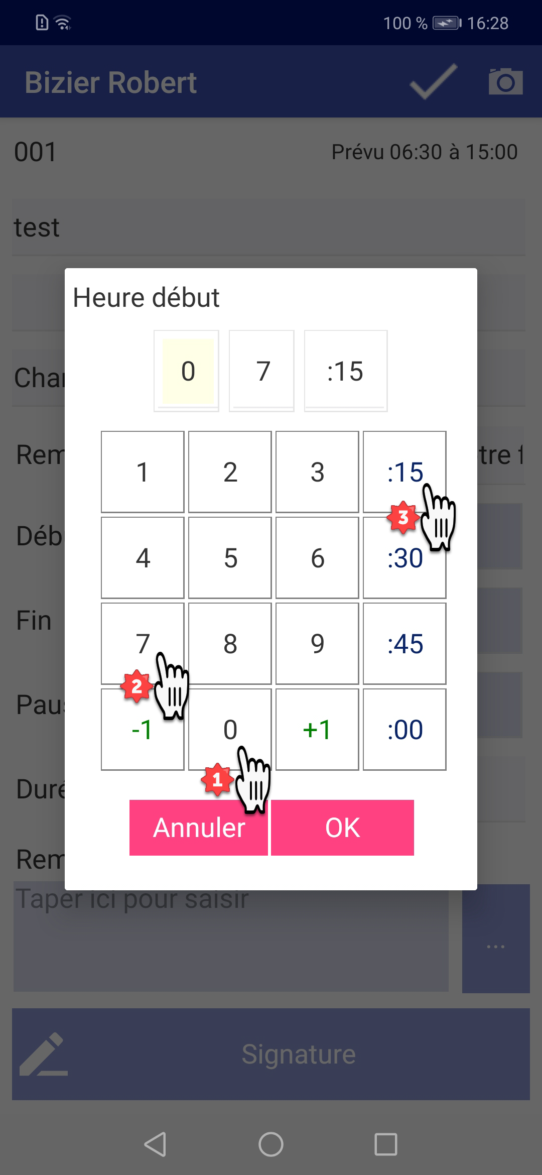 Cliquez sur la zone "Début" pour encoder le temps de prestation