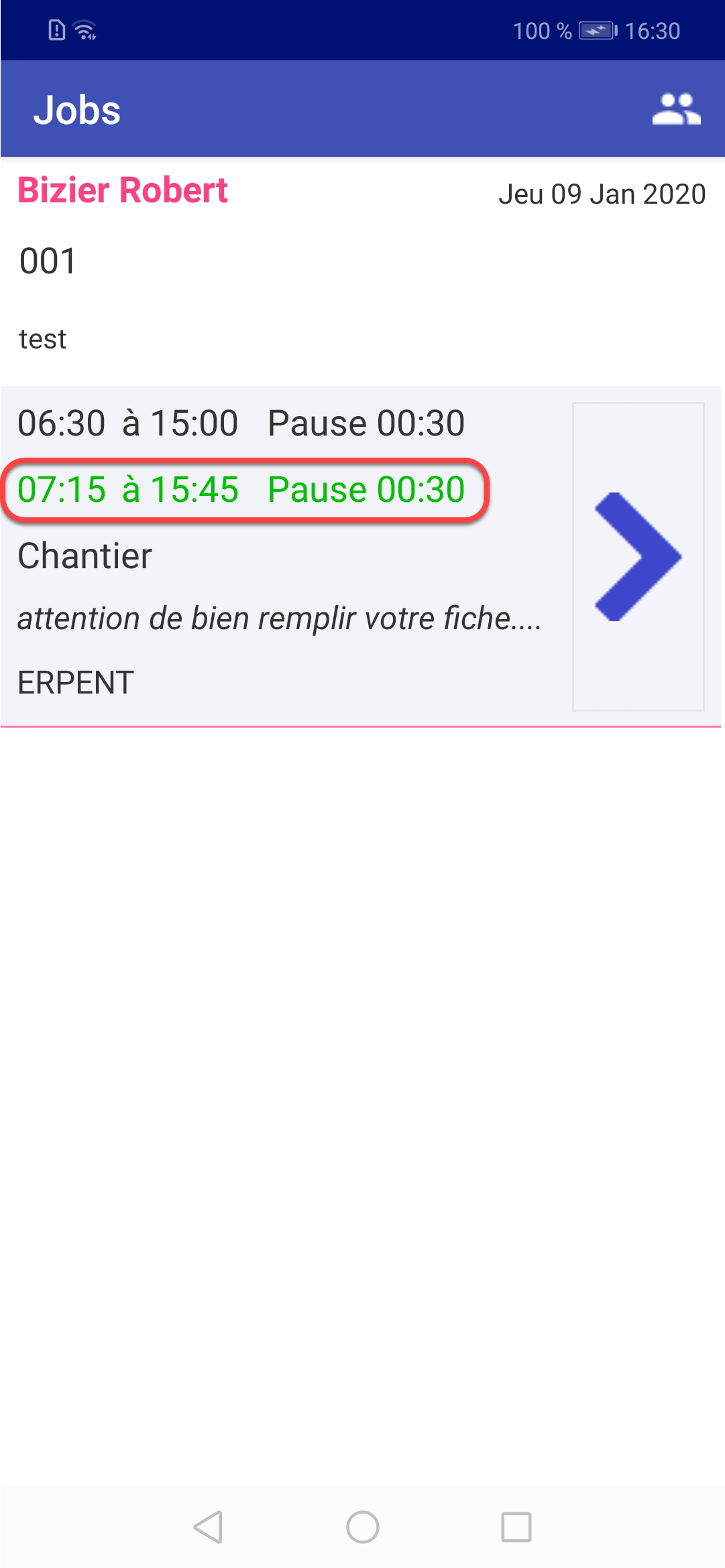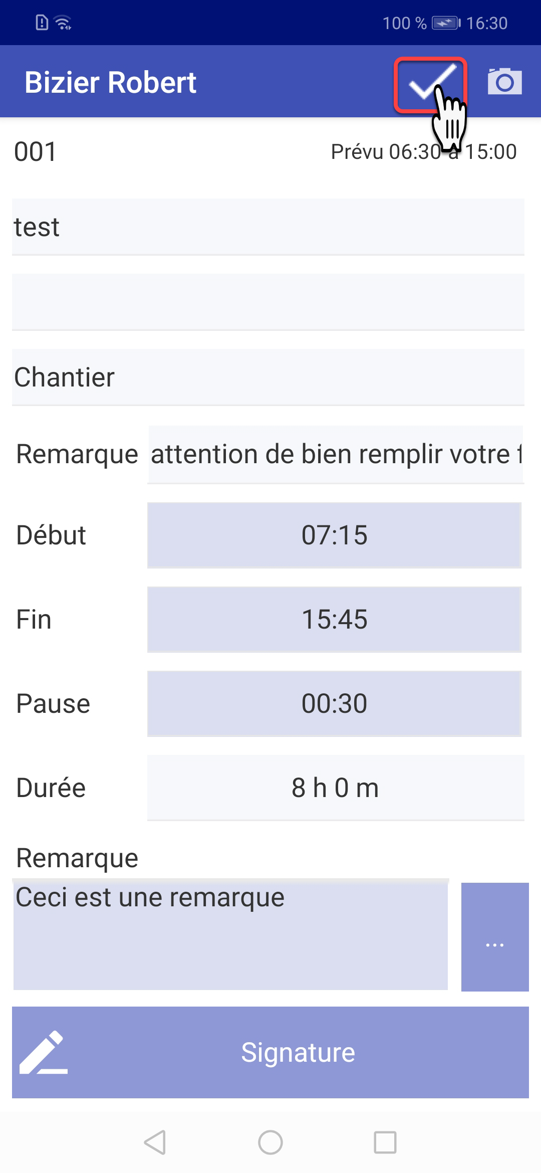 Si le pointage est bien validé, il s'affiche en vert dans l'application