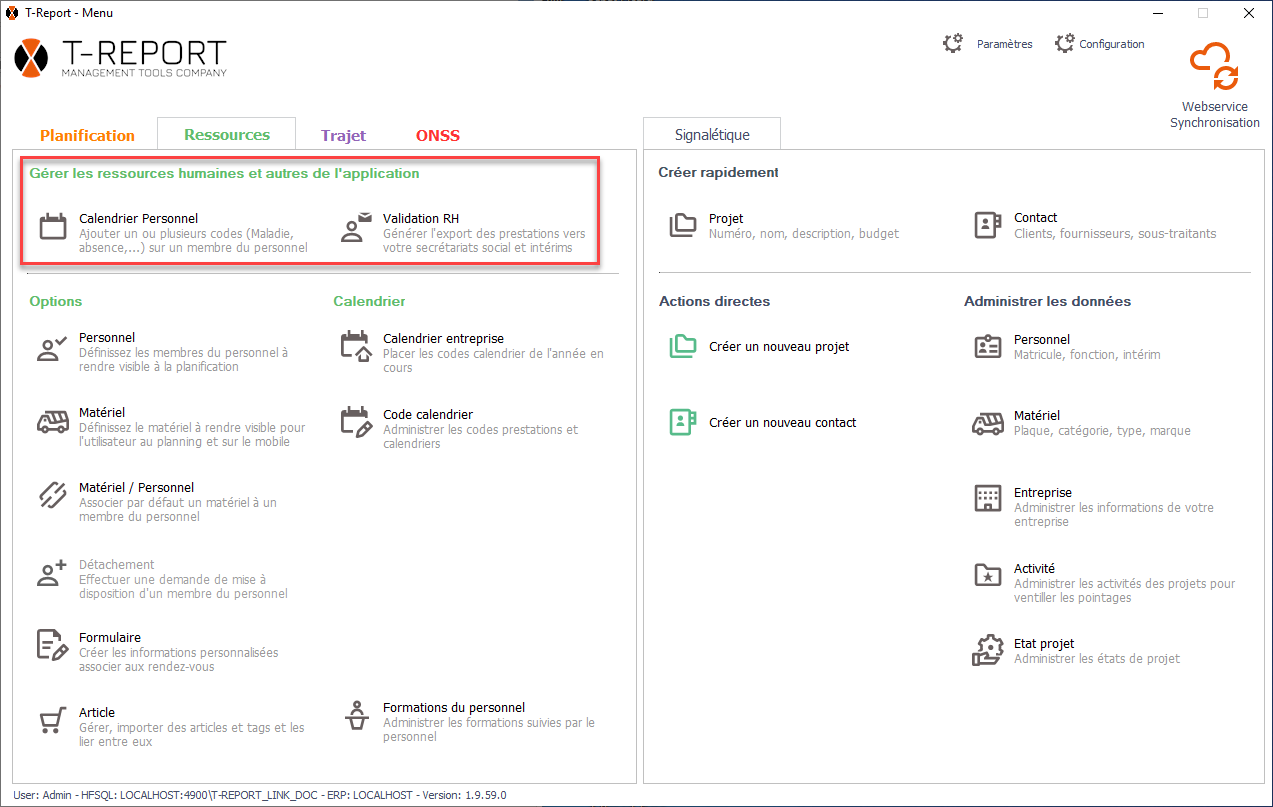La zone "Gérer les ressources humaines" contient les modules "Calendrier Personnel" et "Validation RH".