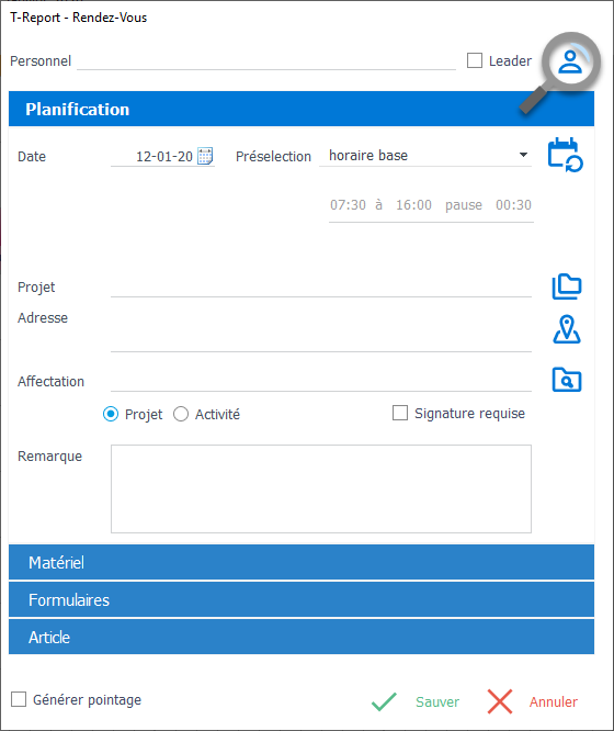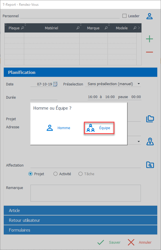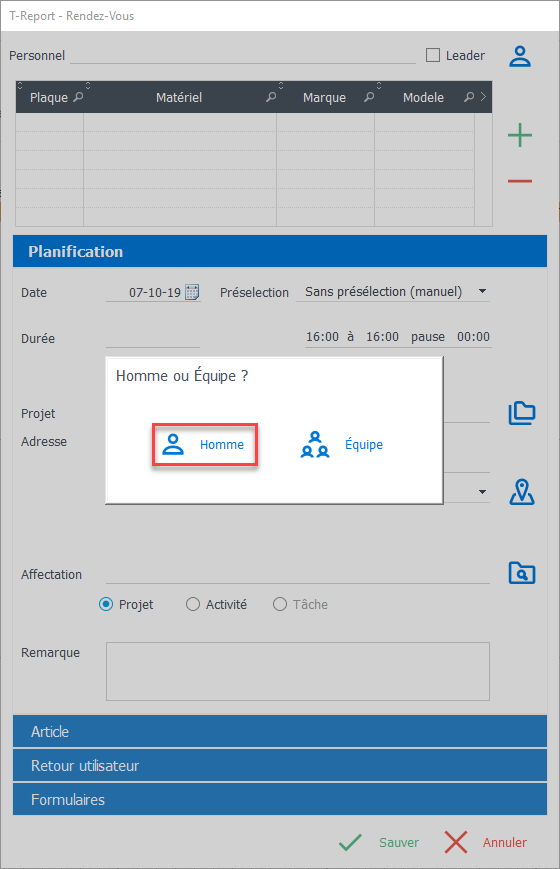 Methode 2 - Ajout par homme ou équipe Cliquez sur l'icône verte "Nouveau" dans la partie droite de la fenêtre "Planning" Une nouvelle fenêtre apparait. Cliquez sur l'icône "Ressources" 1ère possibilité: cliquez sur l'icône "Homme" 2ème possibilité: cliquez sur l'icône "Equipe"