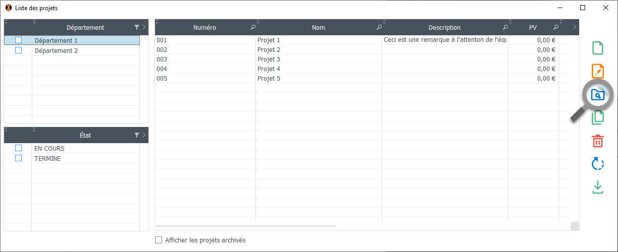 Ouvrir le projet Ouvrir un projet permet d'encoder les tâches, ainsi que calculer son prix de revient et son prix de vente. Sélectionnez le projet à ouvrir en cliquant dessus. Cliquez sur l'icône "Consulter"