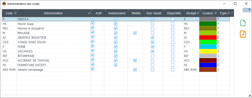 Vous pouvez administrer les différents codes calendriers à partir de cette page.