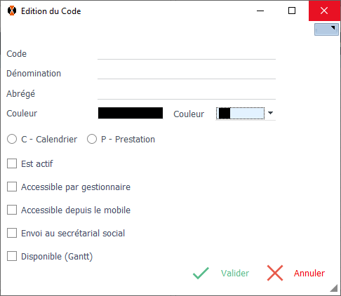 "Case à cocher 'C - Calendrier'/'P - Prestation'" : détermine si le code peut être placé sur un calendrier (C- Calendrier) ou pas (P - Prestation)