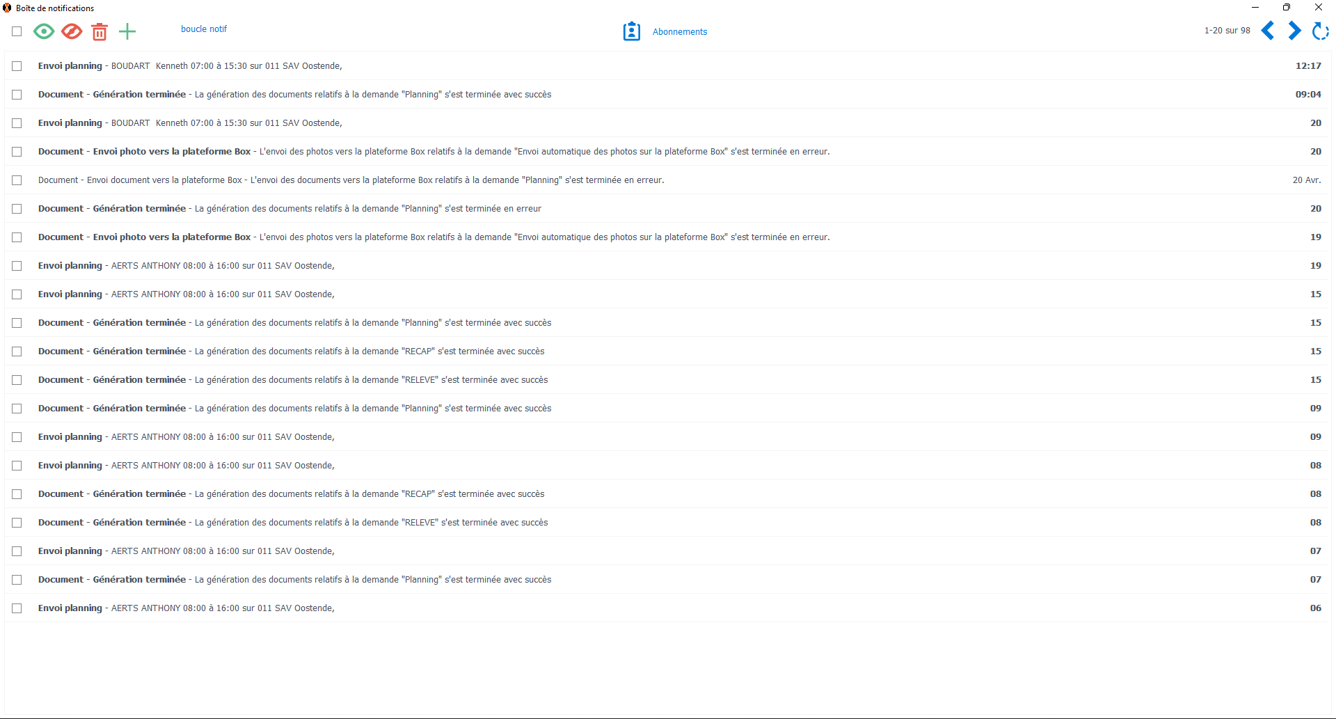 Ci après le premier écran reprennant les notifications internes de l'utilisateur connecté