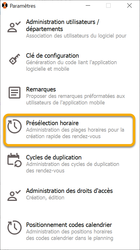 Le module "Présélection horaire" permet de créer des présélections de plage horaire à appliquer sur les rendez-vous. Il est possible de choisir une présélection par défaut qui sera d'office utilisée lors de la création d'un nouveau rendez-vous. Ces préselections horaires sont liées aux départements. Il est également possible de créer plusieurs présélections.