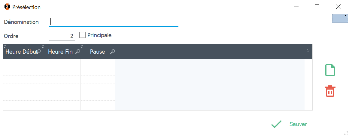 pour créer un nouveau horaire et double-cliquez à l'aide du bouton gauche de la souris dans les champs "Heure Début", "Heure Fin" et "Pause" afin d'indiquer l'horaire. -