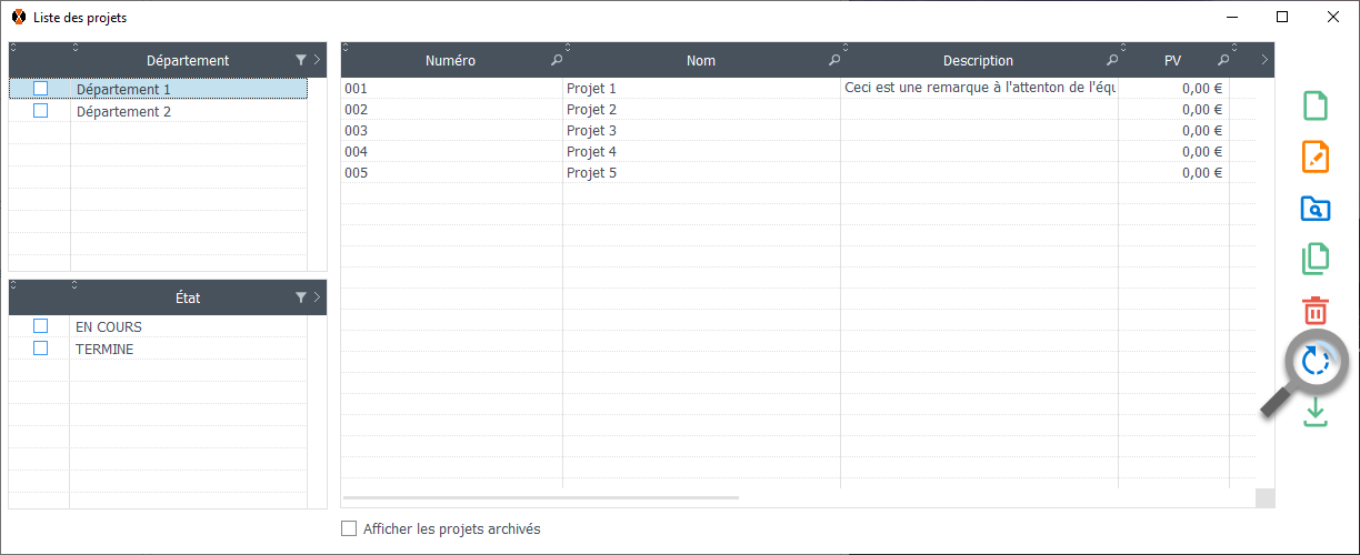 Si votre collègue travaille en parallèle sur la liste des projets, il peut être nécessaire de recharger celle-ci afin de visualiser ses modifications ou ajouts (sans devoir fermer la fenêtre).
