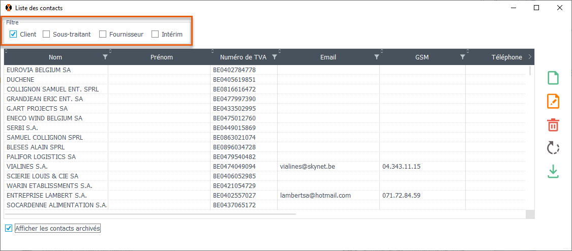Il est possible de filtrer l'ensemble des contacts de l'entreprise créés dans T-Report par type.