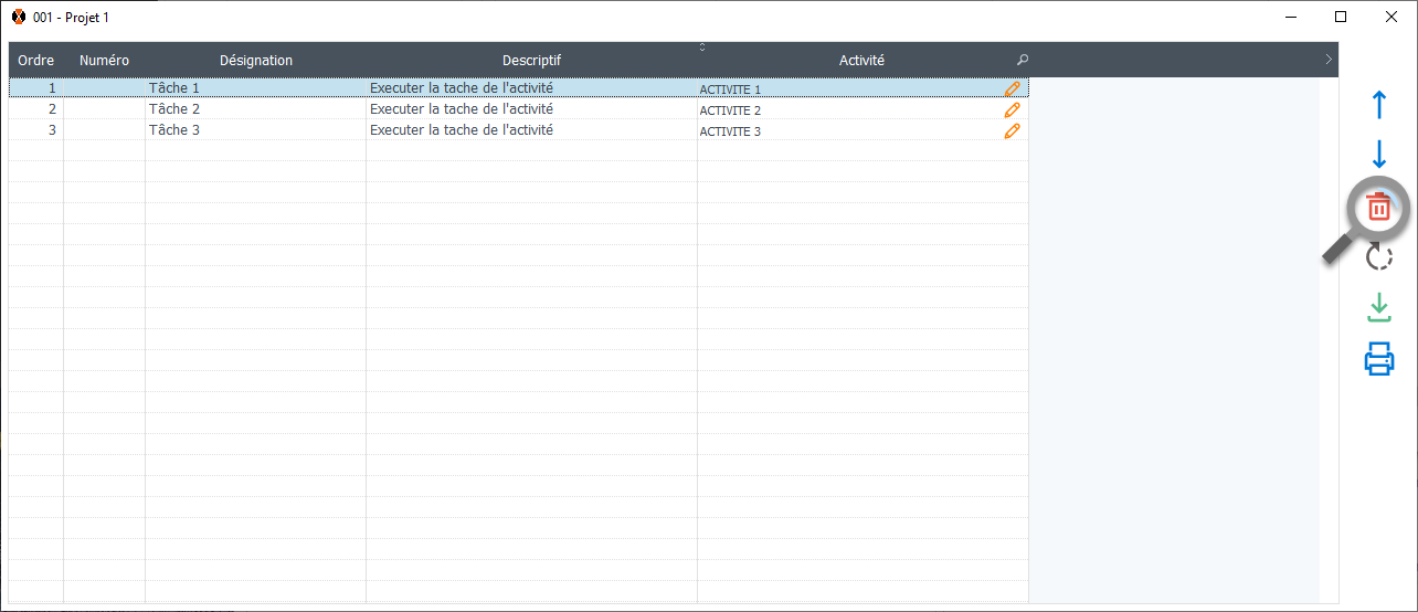 Supprimer une tâche Sélectionnez la tâche à supprimer en cliquant dessus. Cliquez sur l'icône "Supprimer" Une fenêtre de validation s'ouvre. Validez en cliquant sur "Oui".
